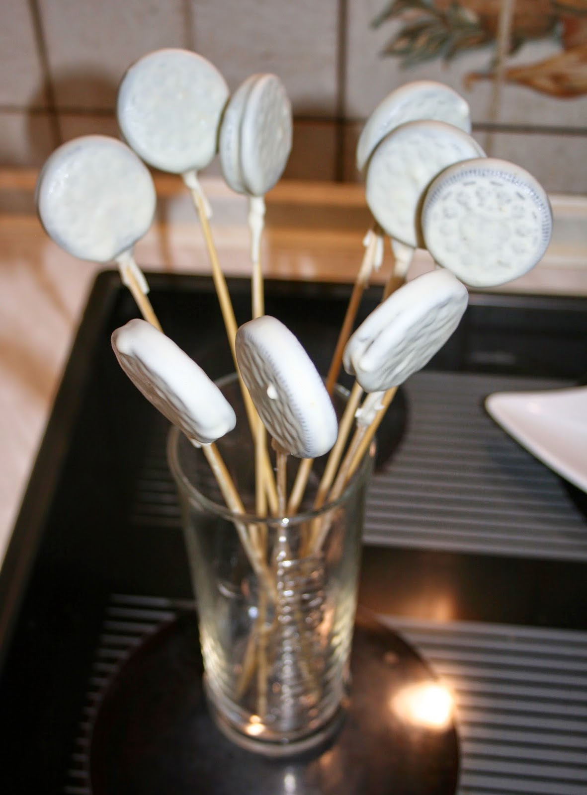 Poleva ze sušenky dost stéká, trvá než zatvrdne. Tak jsem to ve finále dělala u dokořán otevřeného okna - počasí mi přálo, bylo něco okolo nuly - a po namočení jsem "lízátko" dala hned do sklenice, která stála venku na okenním parapetu :-)